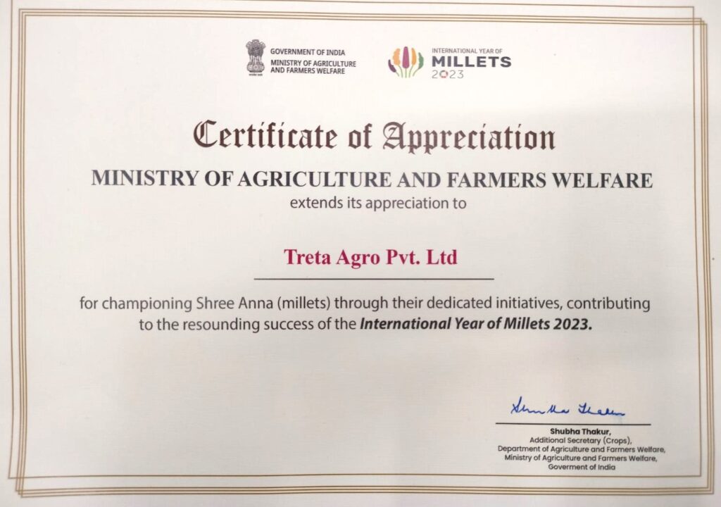 Treta Agro Pvt Ltd Honored by the Ministry of Agriculture and Farmers’ Welfare for Contribution to the International Year of Millets 2023.