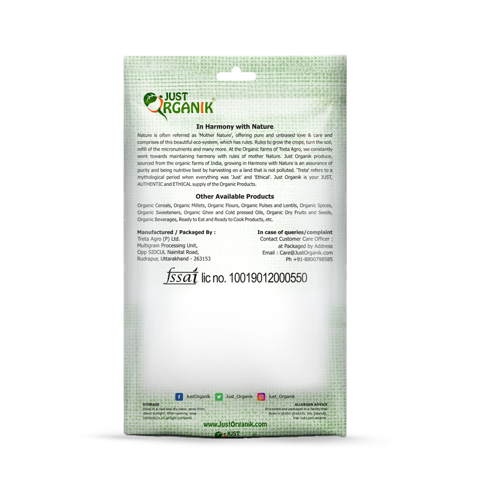 Stone ground, Multigrain flour: Just Organik 9-grains flour or Navratna (meaning nine Gems) Aata contains whole wheat, Pearl millet, barley, ragi, amaranth, maize, brown gram (Kala chana), soybean and sorghum.