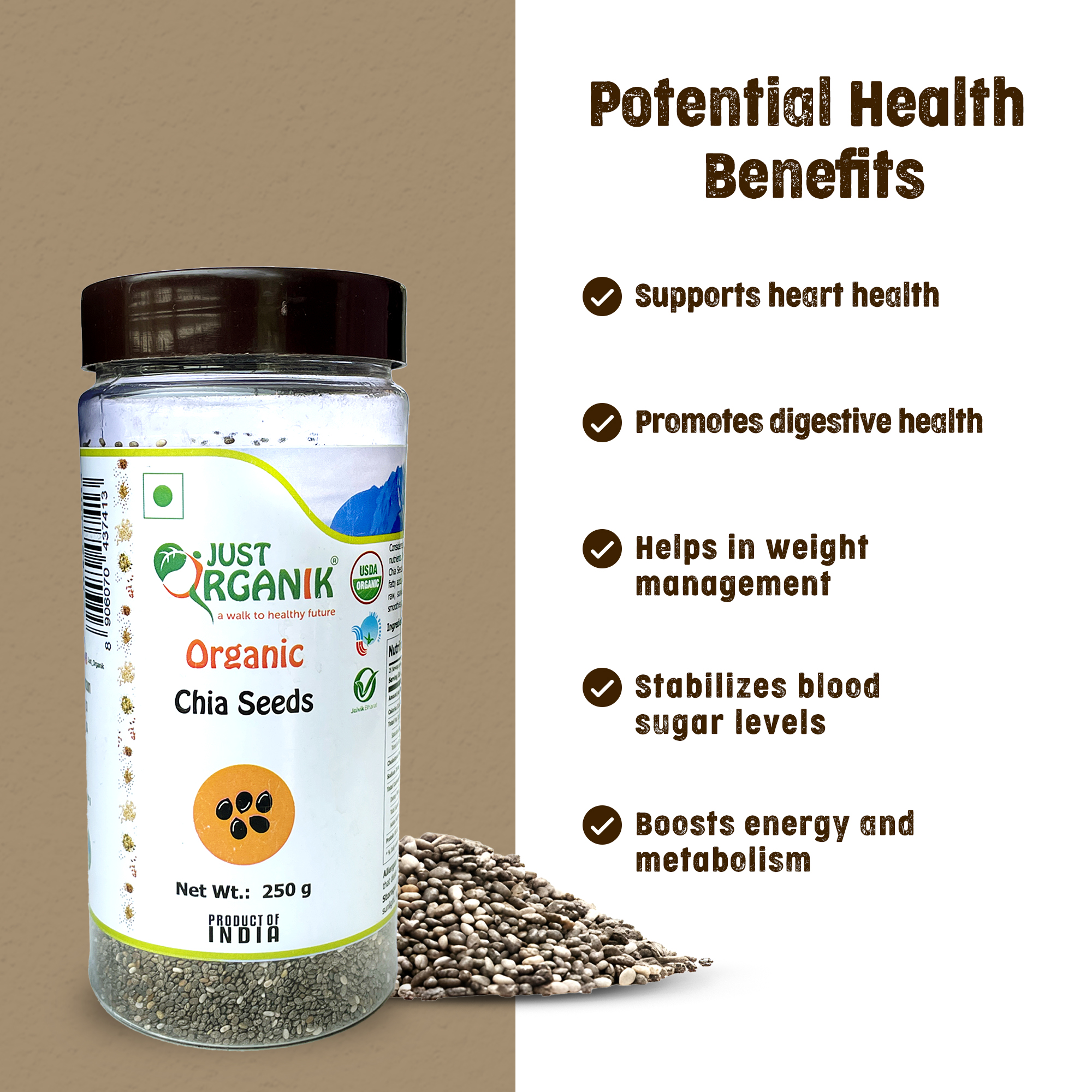 Rich in nutrients: Chia seeds are rich in fiber, proteins, omega-3 fatty acids, antioxidants, Vitamin A, B, E, D and various minerals. As Just Organik procure these from certified organic farms, the intrinsic quality of all these components remains intact.