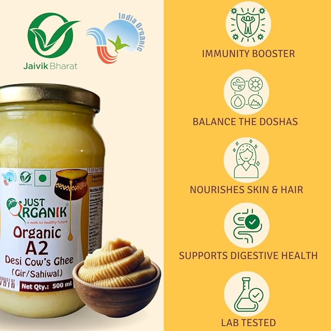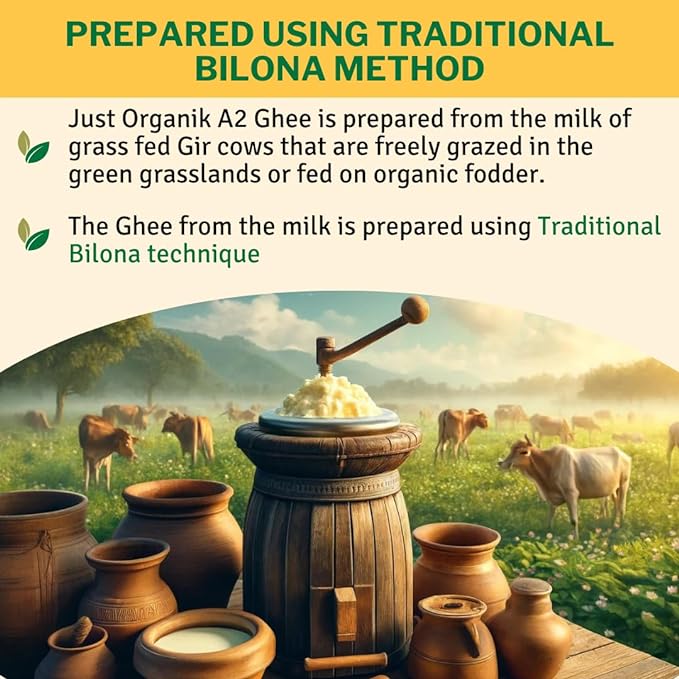 • BILONA METHOD: The history of A2 cow desi ghee dates back to ancient times in the Indian subcontinent. The Bilona method, an age-old traditional process, was used to churn curd from A2 milk. Throughout history, A2 cow desi ghee remained a staple in Indian households for its culinary, medicinal, and Ayurvedic significance. Today, the heritage of A2 cow desi ghee continues to be cherished, with Just Organik preserving the timeless tradition, offering pure and authentic bilona A2 cow desi ghee.