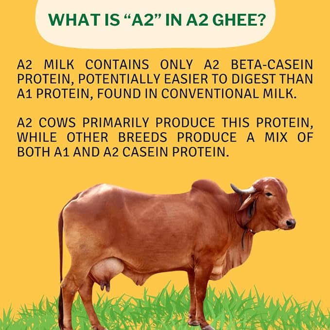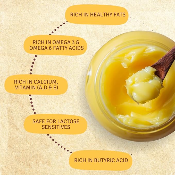 • HEALTH BENEFITS: The Ghee offers several potential health benefits due to its unique composition and traditional preparation: Rich in Healthy Fats: A2 cow ghee is a good source of healthy fats, including medium-chain triglycerides (MCTs), which provide a quick source of energy. Supports Digestive Health: Ghee aids digestion by promoting the secretion of stomach acids and supporting a healthy gut lining.