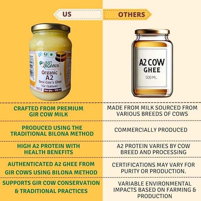 • Just Organik A2 Cow Desi Ghee is made from the A2 milk extracted from Desi cow (Gir).