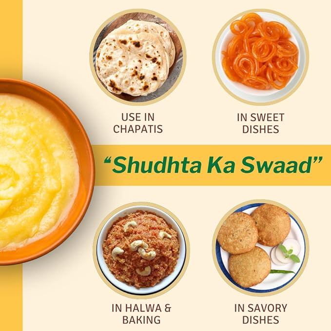 • AYURVEDIC USES: In Ayurveda, ghee is prized for its medicinal properties and is used in herbal formulations and as a carrier for herbal remedies, It is used topically in Ayurveda for moisturizing and nourishing the skin.