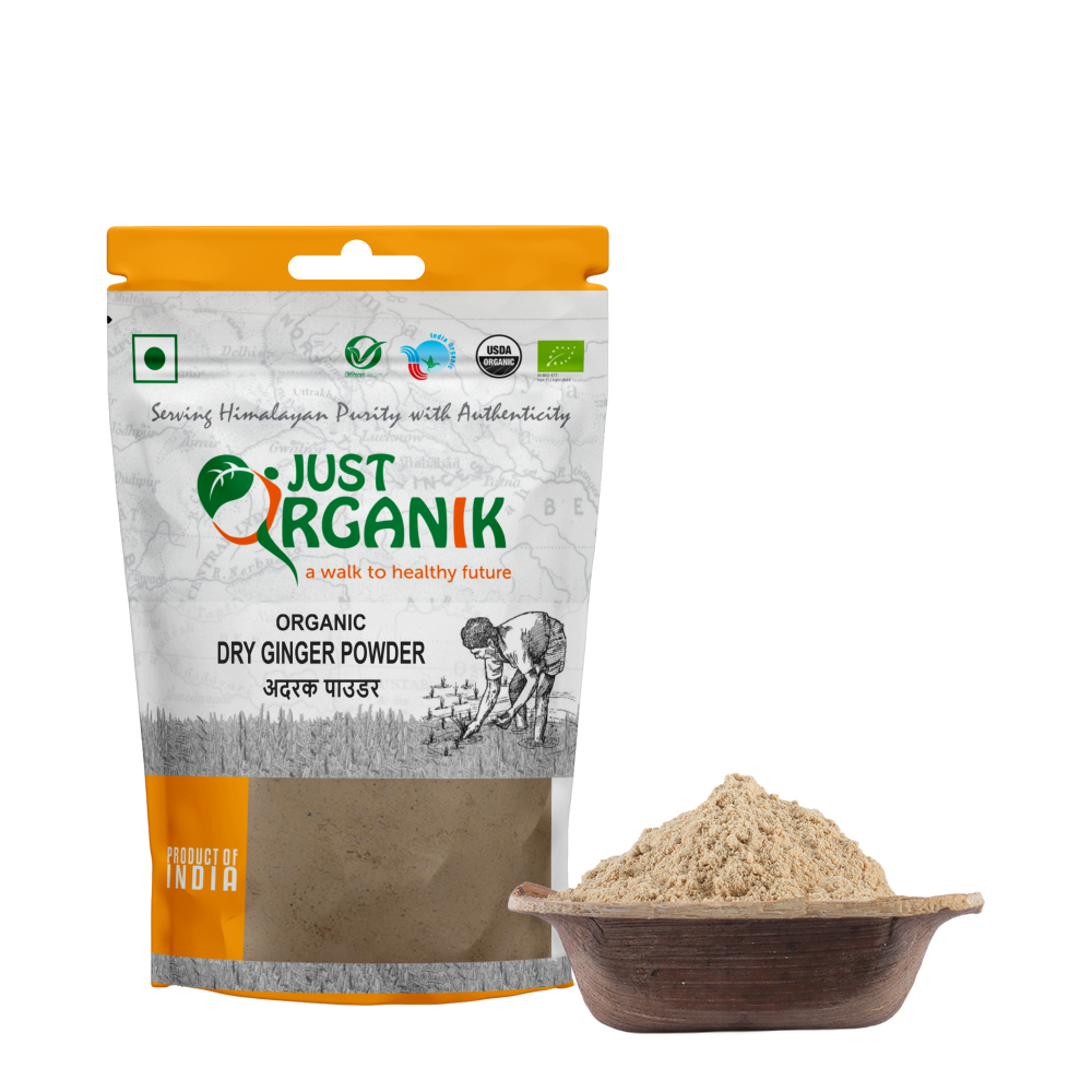 Dry Ginger Powder: Just Organik dry ginger powder can be used in many food preparation as well as in home-based treatments. A special drink made out of dried ginger powder, along with other spices like black pepper and coriander seeds, is popular in southern India and is known as ?Sukku kappi?. It is considered a perfect drink in the winter mornings, although people also drink it during summers. Dried ginger powder is commonly used to flavour ginger breads.?
