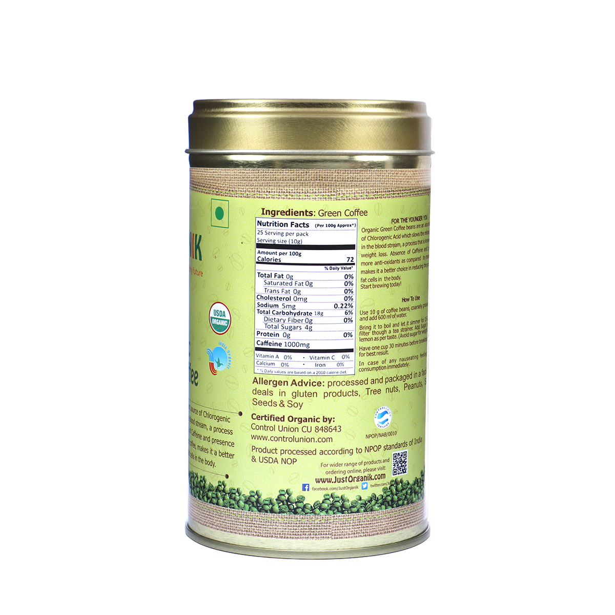 ?Anti-Ageing Properties: Green coffee is packed with chlorogenic acids that hold antioxidant properties. They are known to promote the regeneration of new skin cells, concealing fine lines and wrinkles.?