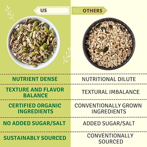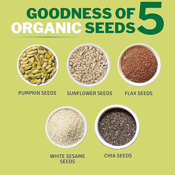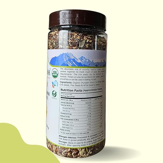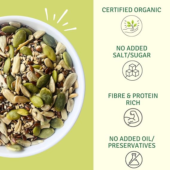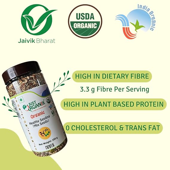 Healthy seeding Mix : Just Organik Healthy Seeding is a special mix of organic seeds. It contains Pumpkin Seeds, Sunflower Seeds, Flax Seeds, Black Sesame Seeds, White Sesame Seeds and Chia Seeds.