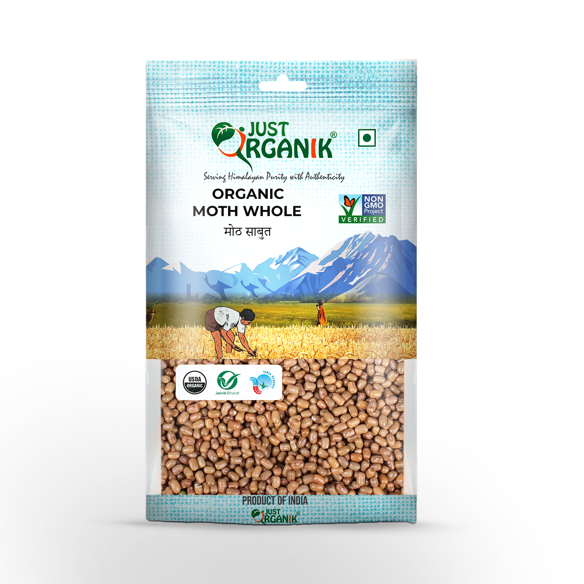 Just Organik Moth Whole Dal is certified organic. Our farmers practice ancient natural vedic style of farming, using organic manure like animal excreta, vegetable compost and neem cakes and use methods like crop rotation and hand weeding to maintain soil fertility to produce the wholesome crop which is very high in its nutrient content. No chemicals, pesticides, or preservatives are used in its production.