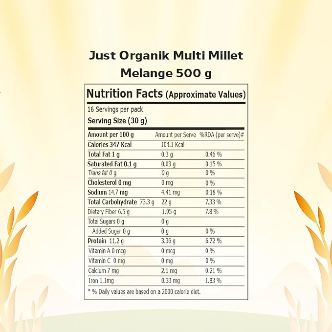 - CONSTITUENTS: Just Organik Multi Millet Melange consists of Pearl Millet (Bajra), Proso Millet, Kodo Millet, Sorghum (Jowar) and Maize.