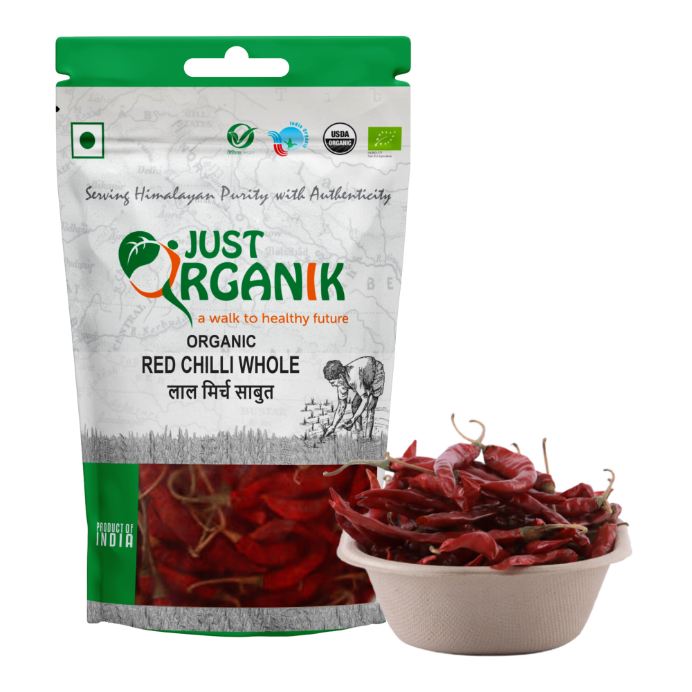 Red Chilli Whole: Just Organik’s whole red chillies Whole Chilli is sourced from Uttarakhand and is a good source of several nutrients making it a healthy addition to meal preparation. Chilli is considered as one of the best spices used in kitchen. Red chillies are used in cooking, pickles and chutney. Red chillies are used dried as well as in powdered form both in vegetarian and non-vegetarian cooking.