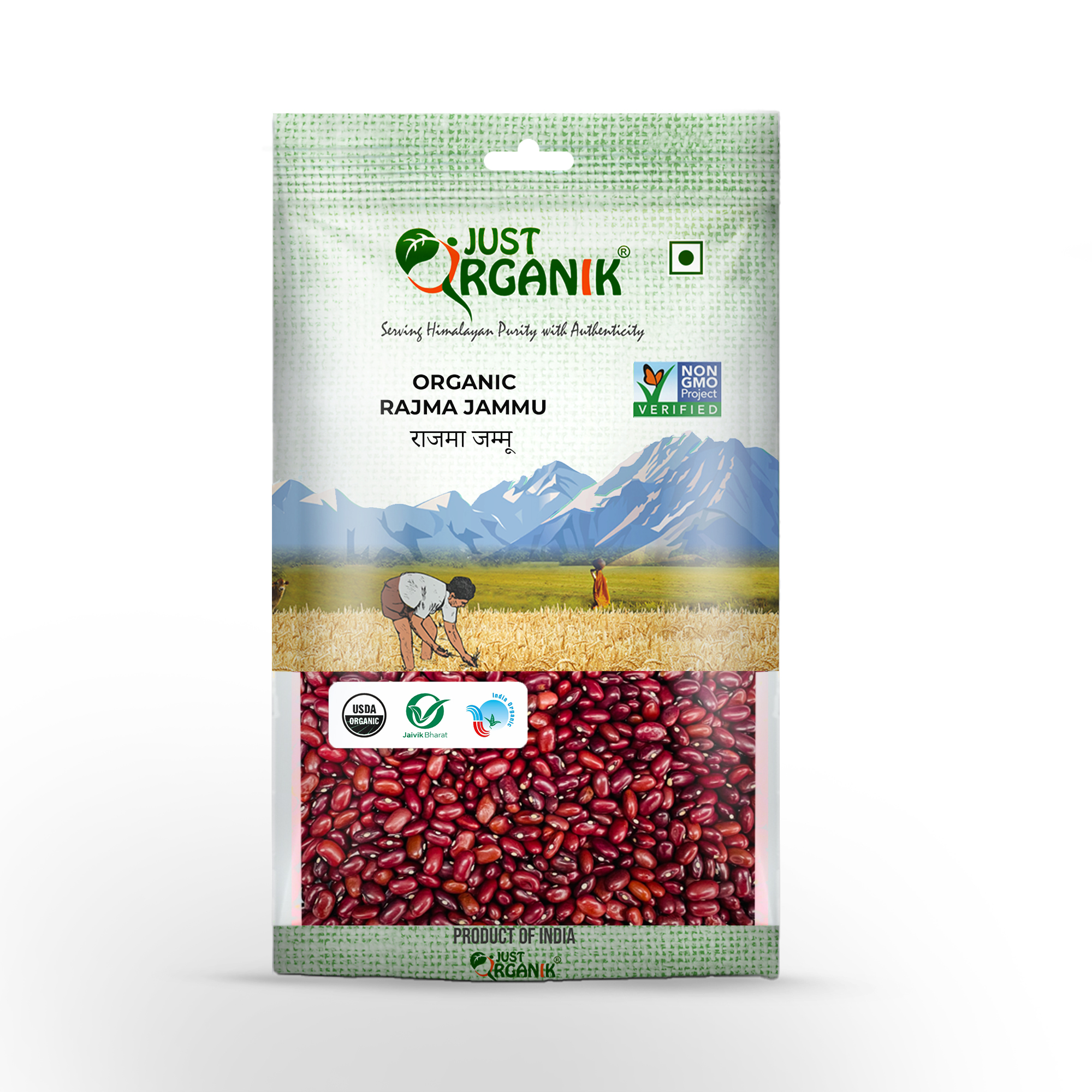 Just Organik Rajma Jammu is the dark red-colored kidney beans, sourced from Upper Himalayan regions. The traditional practices of growing, complying with organic farming standards maintain the aroma, subtle taste, and nutritional value within.